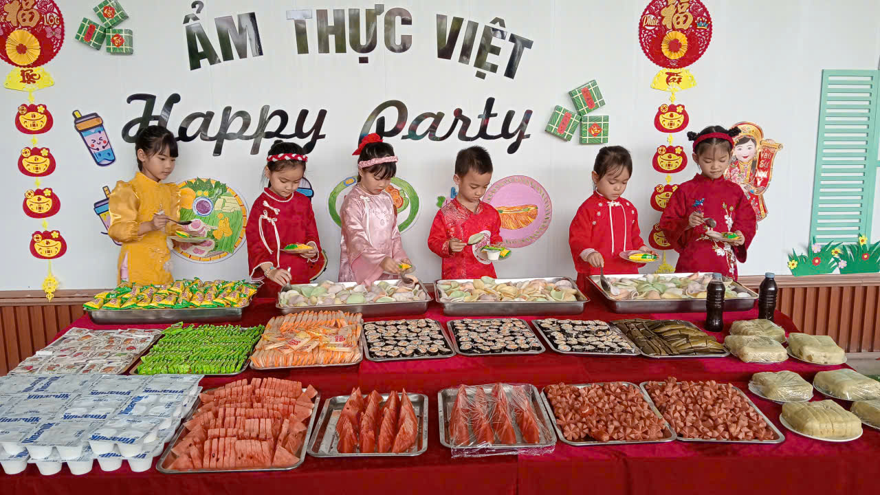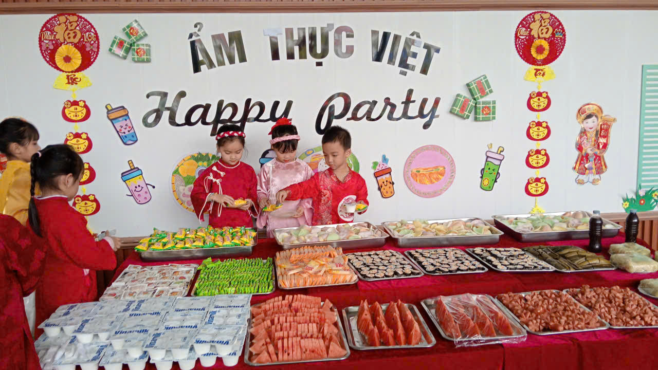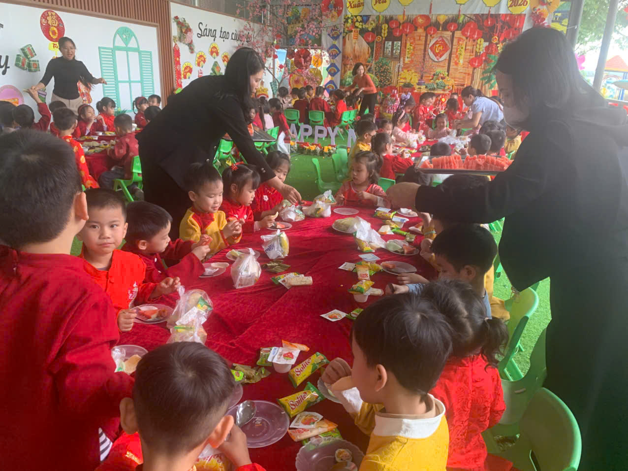 Bên cạnh đó, các trò chơi dân gian quen thuộc đã mang đến tiếng cười rộn rã, giúp trẻ mạnh dạn, tự tin và gắn kết hơn với bạn bè. Kết thúc chương trình là bữa tiệc buffet dành cho trẻ, với không gian ấm cúng, vui vẻ, giúp các bé có thêm những khoảnh khắc Tết thật trọn vẹn bên cô và bạn.