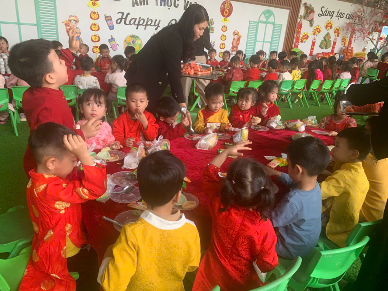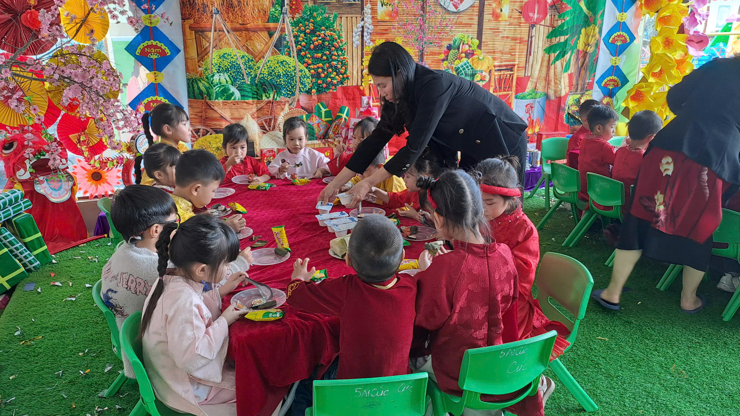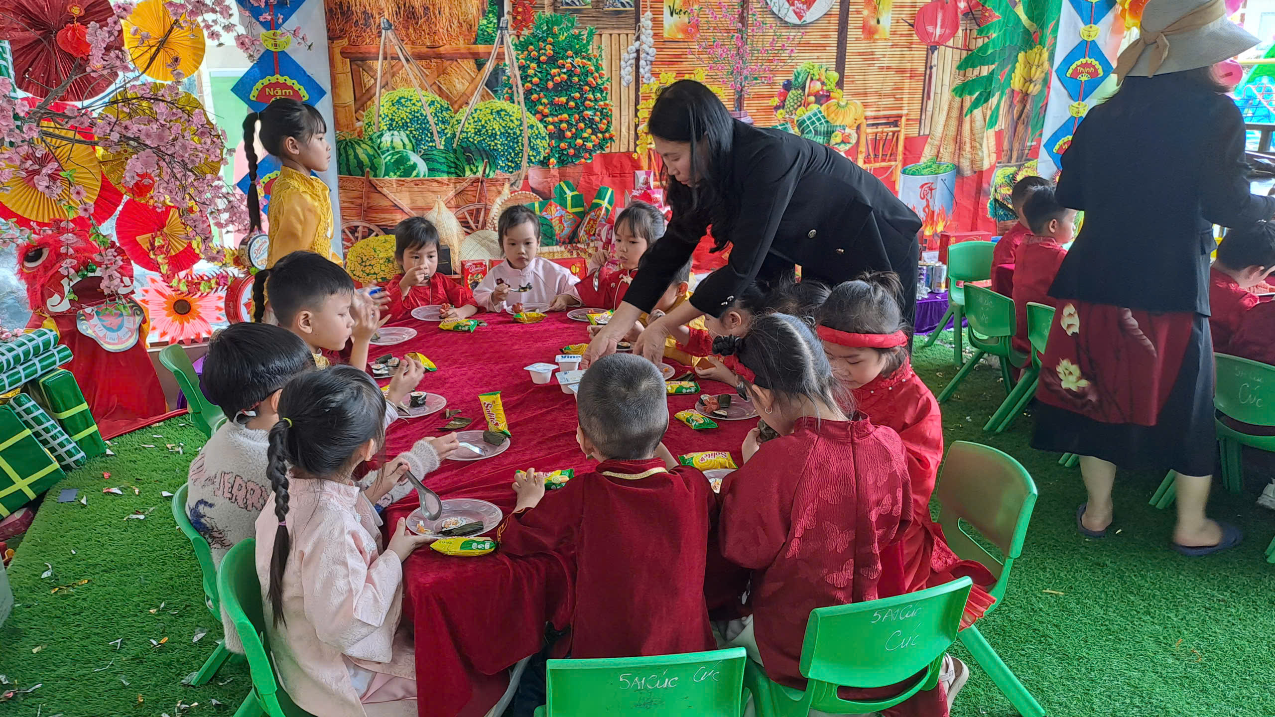Bên cạnh đó, các trò chơi dân gian quen thuộc đã mang đến tiếng cười rộn rã, giúp trẻ mạnh dạn, tự tin và gắn kết hơn với bạn bè. Kết thúc chương trình là bữa tiệc buffet dành cho trẻ, với không gian ấm cúng, vui vẻ, giúp các bé có thêm những khoảnh khắc Tết thật trọn vẹn bên cô và bạn.